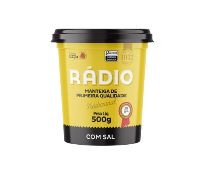 A Manteiga Rádio foi o primeiro produto da marca e continua sendo referência em qualidade. Produzida com creme de leite puro, está disponível em embalagens de 200g, 500g e 5kg.
