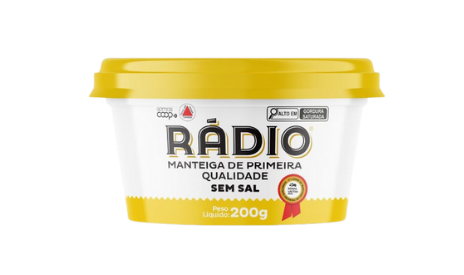 A Manteiga Rádio foi o primeiro produto da marca e continua sendo referência em qualidade. Produzida com creme de leite puro, está disponível em embalagens de 200g, 500g e 5kg.