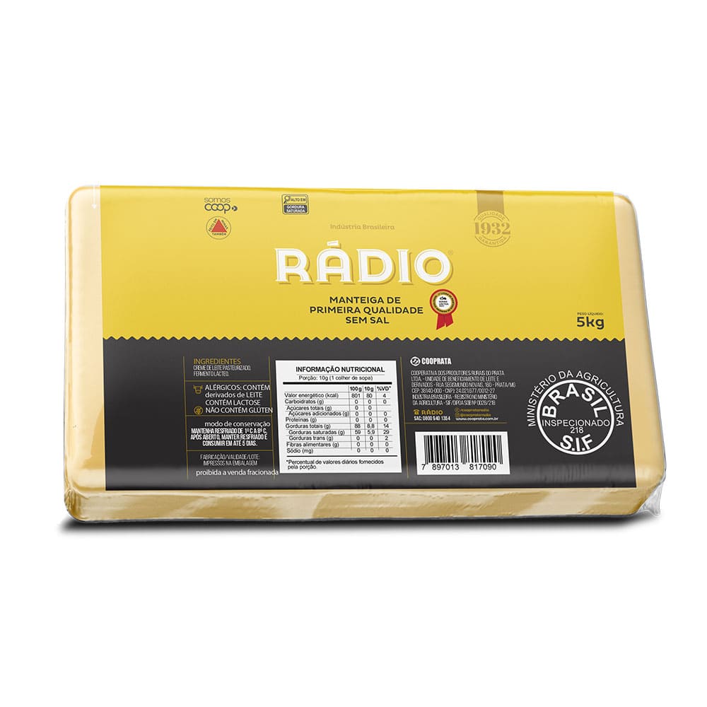 A Manteiga Rádio foi o primeiro produto da marca e continua sendo referência em qualidade. Produzida com creme de leite puro, está disponível em embalagens de 200g, 500g e 5kg.